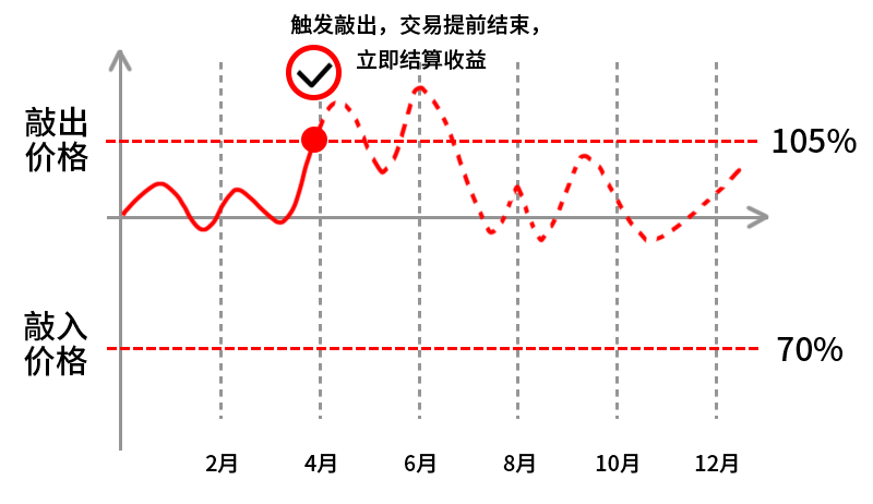 損益情形一、只觸發(fā)敲出事件。假設(shè)產(chǎn)品在第4個月的敲出觀察日,中證500指數(shù)為7370點,超過7350點的敲出價格,觸發(fā)敲出事件,則產(chǎn)品提前結(jié)束。投資者共持有產(chǎn)品4個月,獲得1000000*18%*(4/12)=60000元的收益。如下圖所示: