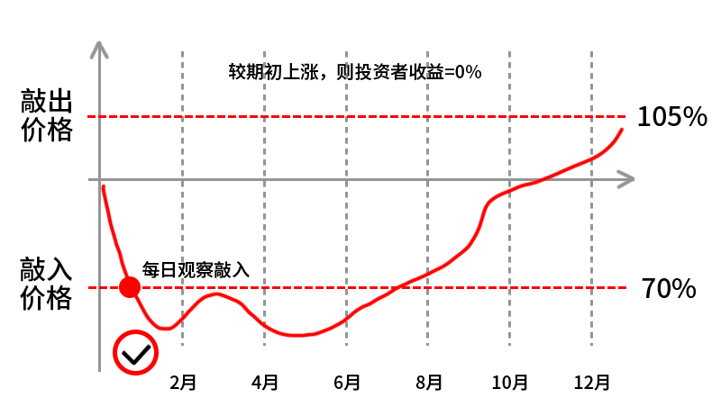 一是產(chǎn)品到期時,中證500指數(shù)大于或等于期初7000點的初始價格,投資者收益率為0%。如下圖所示。